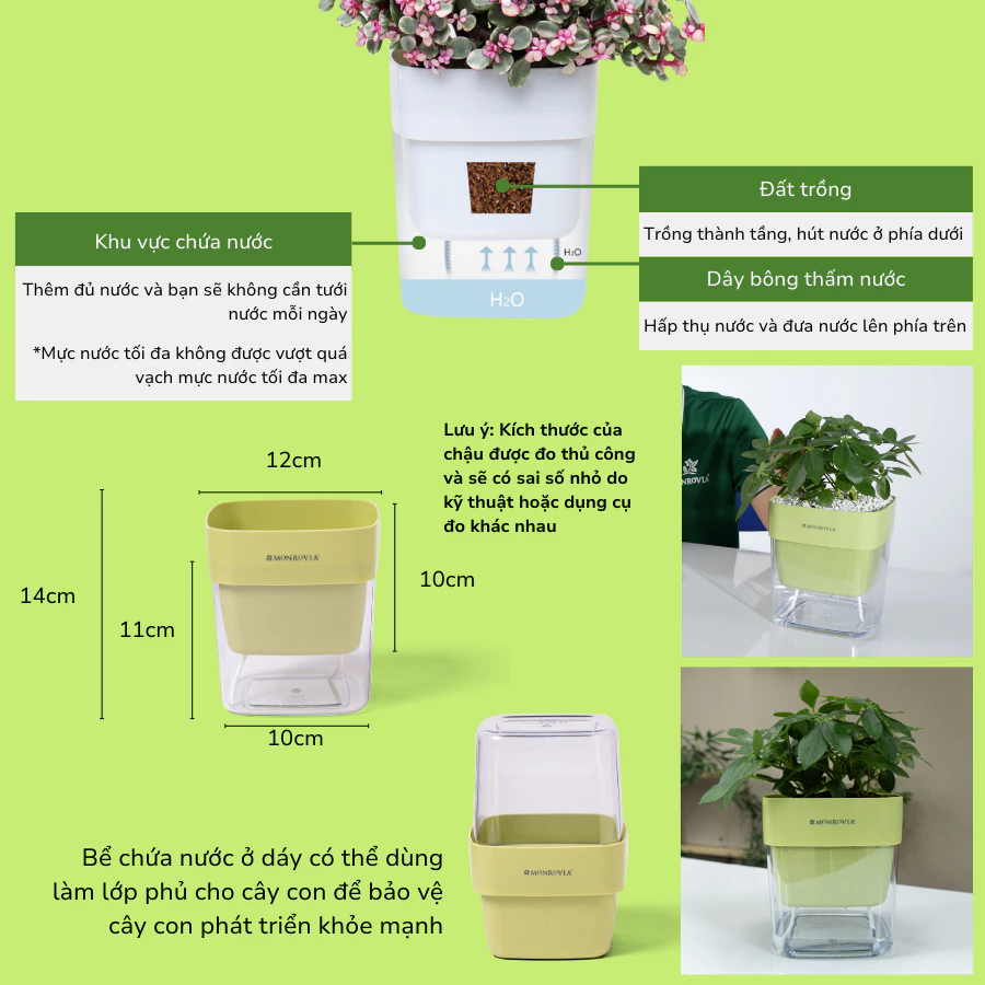 🌱 Cơ chế tự dưỡng ẩm thông minh: Giống như một người bạn tận tâm, chậu MONROVIA giúp bạn chăm sóc cây một cách dễ dàng. Chỉ cần đổ nước vào chậu, hệ thống dây cotton thông minh sẽ tự động thẩm thấu và cung cấp lượng nước vừa đủ cho cây theo nguyên lý hút nước tự nhiên.