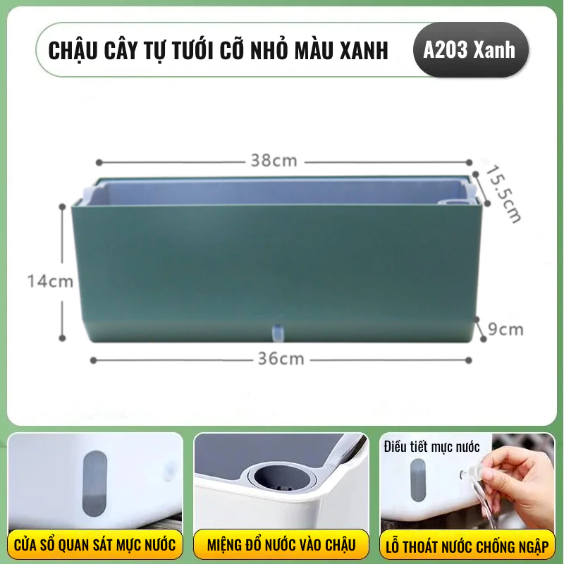 1. Thiết kế hiện đại: Chậu có chiều dài miệng 38cm, chiều rộng miệng 15cm, độ cao thân 14cm, đáp ứng nhu cầu bố trí cây xanh trong nhà và ngoài trời.