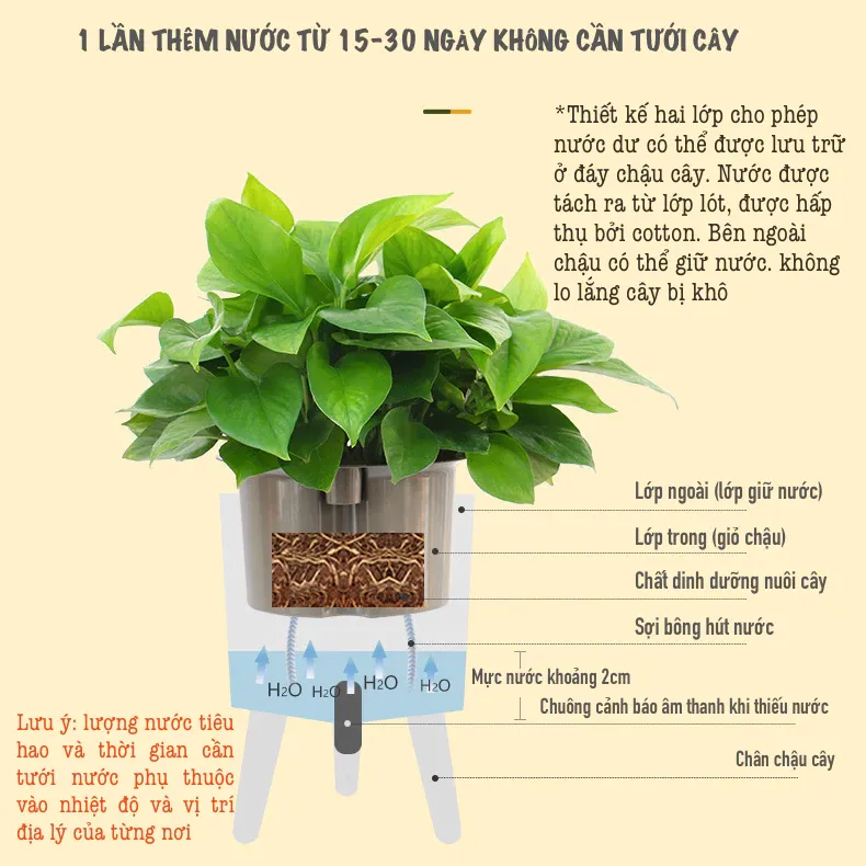 - Nguyên tắc tự tưới: Dây Cotton hút nước từ đáy chậu.