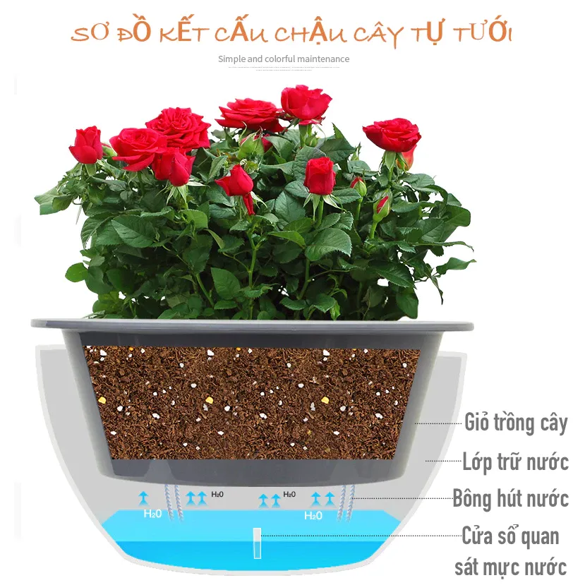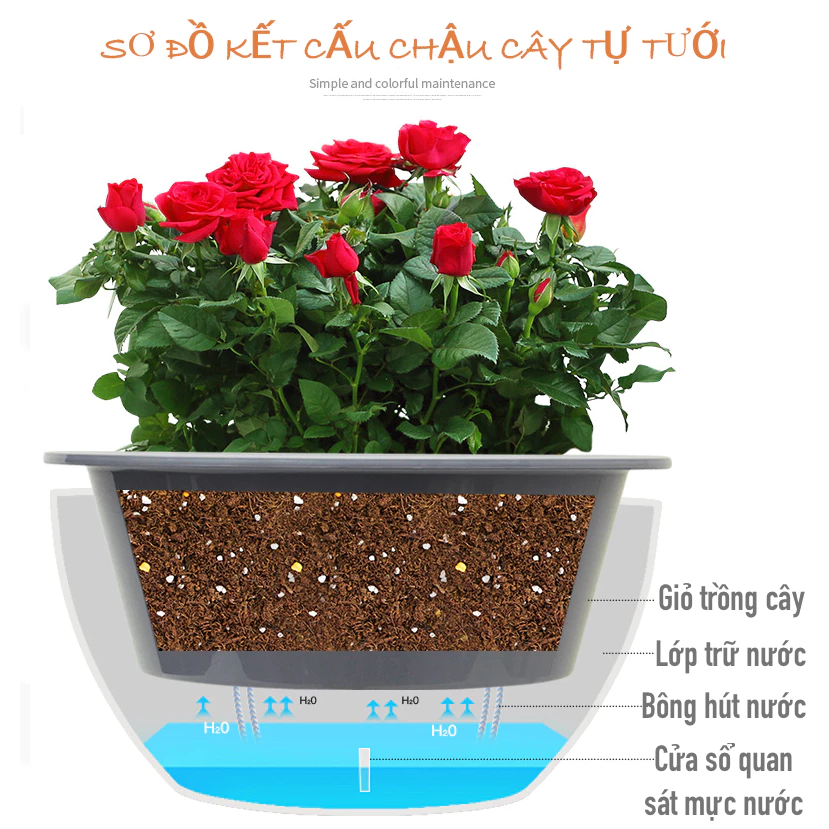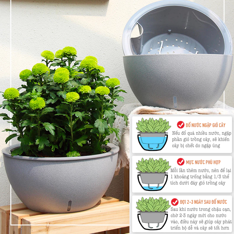 🌱 Thiết kế thông minh và tiện dụng: Chậu có thiết kế thông minh với hai lớp: lớp ngoài dùng để chứa nước và lớp trong dùng để trồng cây. Hệ thống bông thấm hút nước giúp rễ cây tiếp cận được lượng nước cần thiết, đảm bảo cây luôn phát triển khỏe mạnh.