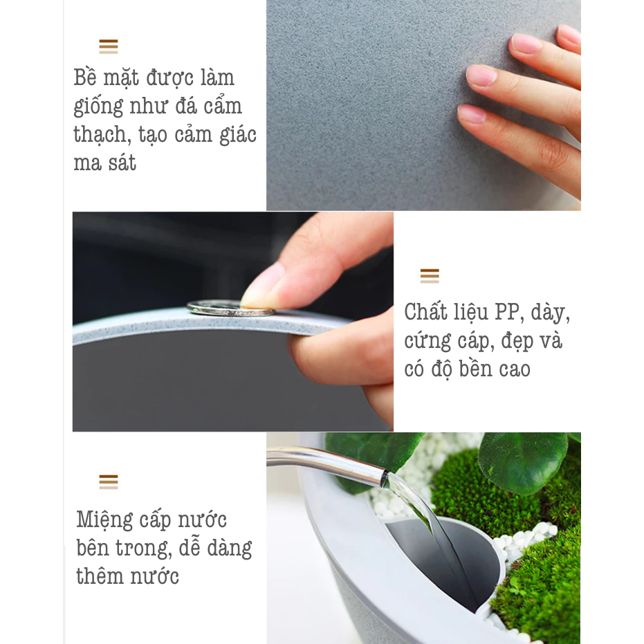 🌱 Chất liệu nhựa PP bền bỉ: Chậu được làm từ nhựa PP cao cấp, tạo cảm giác ma sát giống đá cẩm thạch. Chất liệu này không chỉ bền, đẹp mà còn dễ dàng vệ sinh và bảo trì.