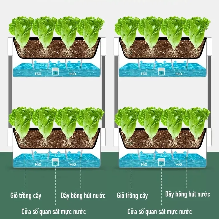🌿 Hệ thống tưới nước tự động: Chậu được thiết kế với hệ thống tưới nước thông minh, giúp nước được cung cấp đều đặn cho từng tầng cây mà không cần phải tưới nước mỗi ngày. Bạn chỉ cần bổ sung nước vào khoang chứa nước dưới đáy chậu, nước sẽ tự động di chuyển lên các tầng cây thông qua dây cotton thẩm thấu ngược, giữ đất luôn ẩm mà không lo ngập úng.