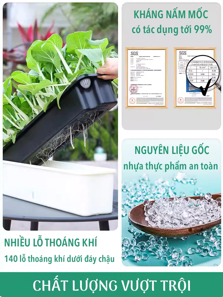 Chậu trồng rau sân thượng tự tưới được sản xuất từ nhựa PP cao cấp, mang lại nhiều ưu điểm vượt trội: