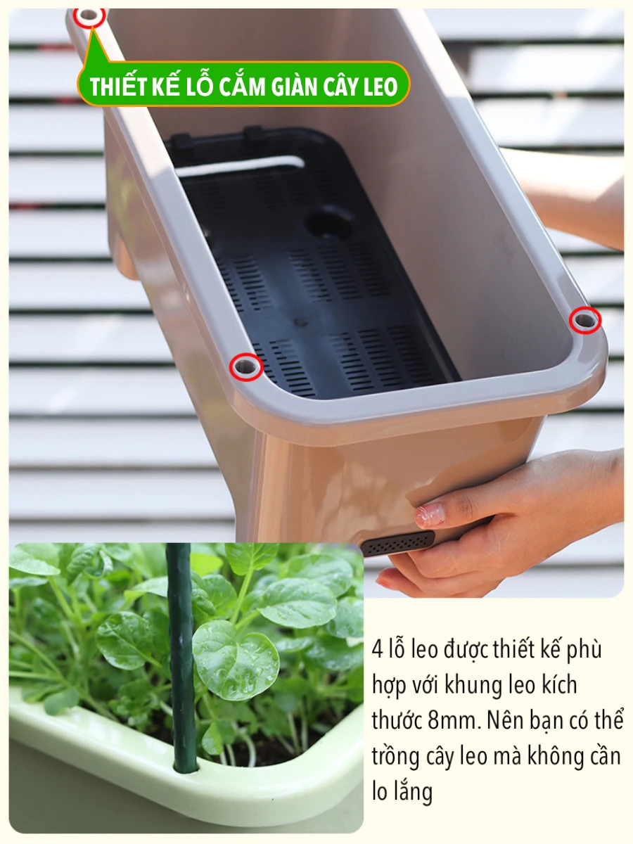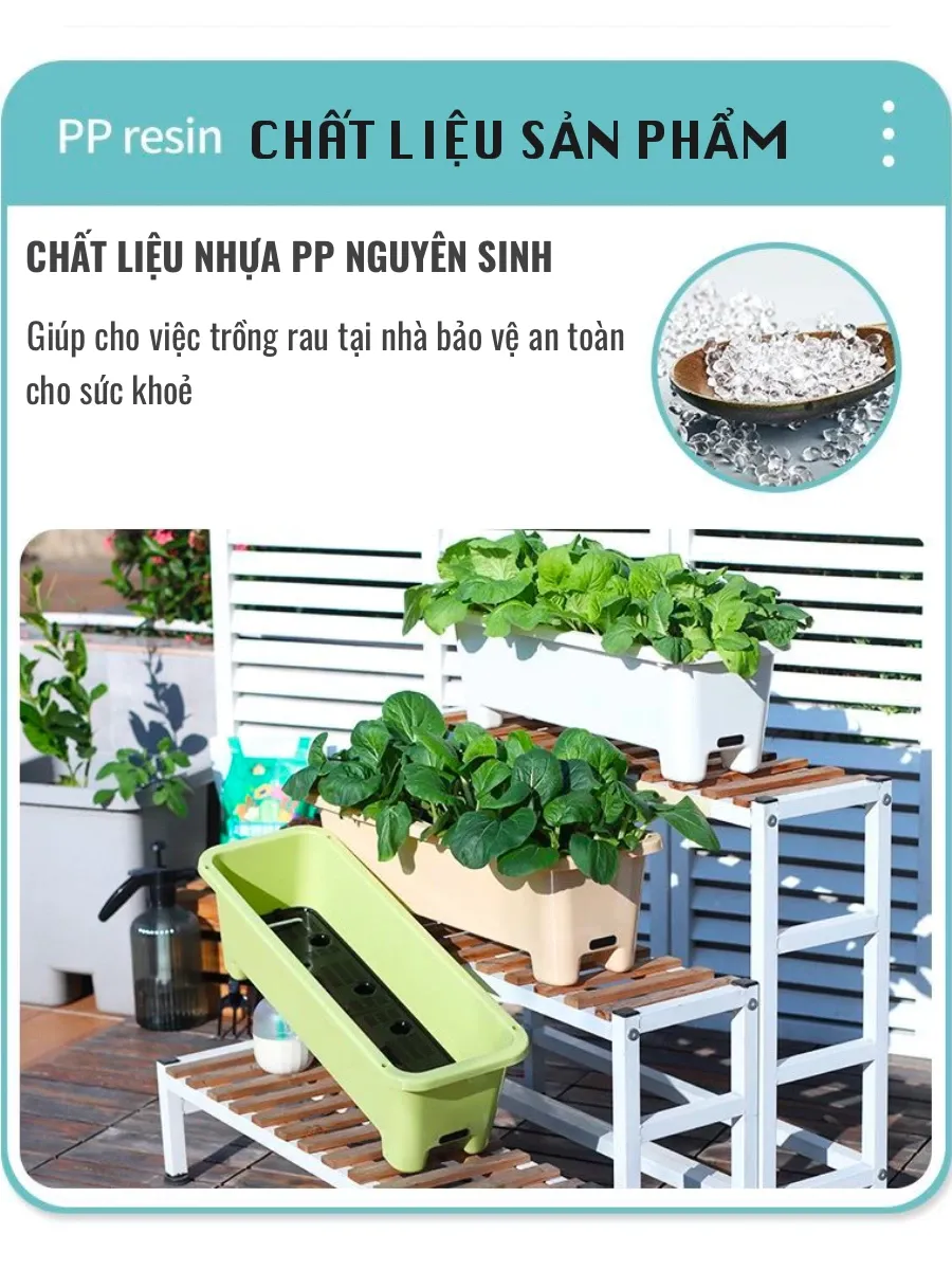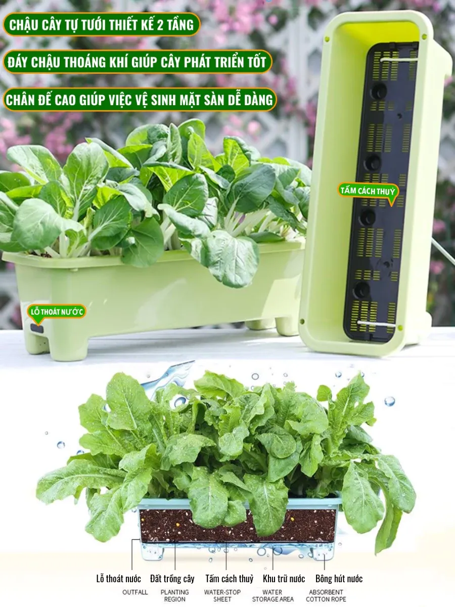 🌸 Giúp rau phát triển mạnh mẽ: Với khả năng duy trì độ ẩm ổn định, chậu tự tưới hỗ trợ sự phát triển khỏe mạnh của cây trồng, mang lại những mẻ rau tươi ngon ngay tại nhà.