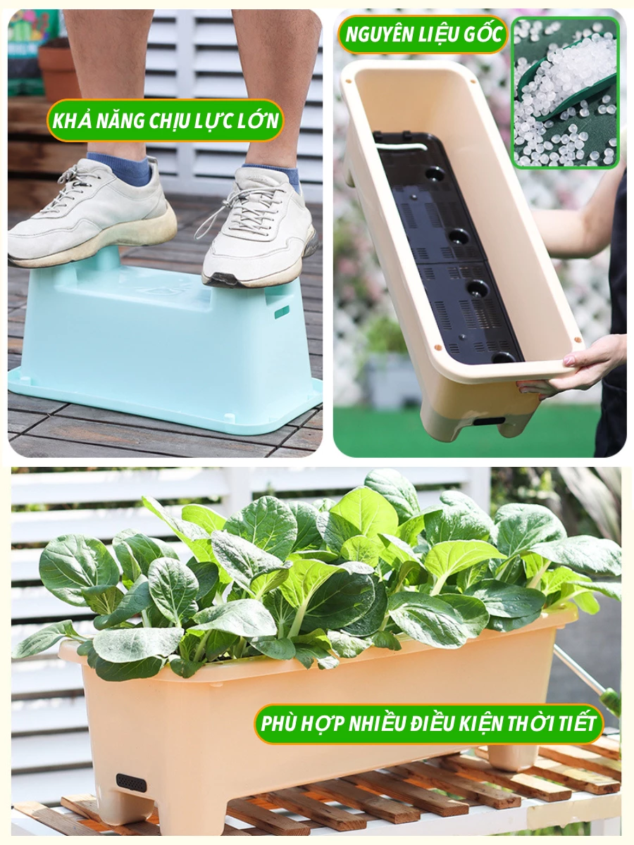 🌿 Chất liệu nhựa cao cấp: Chậu trồng rau được làm từ nhựa PP nguyên sinh, đảm bảo an toàn cho sức khỏe và bền bỉ dưới mọi điều kiện thời tiết. Chất liệu này không chỉ nhẹ, dễ di chuyển mà còn chống phai màu, giữ cho chậu luôn mới mẻ, sạch sẽ theo thời gian.