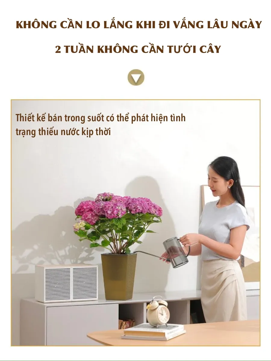 ✅ Tiết kiệm thời gian chăm sóc: Với chậu trồng cây thông minh, bạn không cần phải lo lắng về việc tưới nước thường xuyên. Chỉ cần đổ nước vào khu lưu trữ và để hệ thống tự tưới làm việc trong khoảng 2 tuần, giúp bạn tiết kiệm thời gian và công sức.