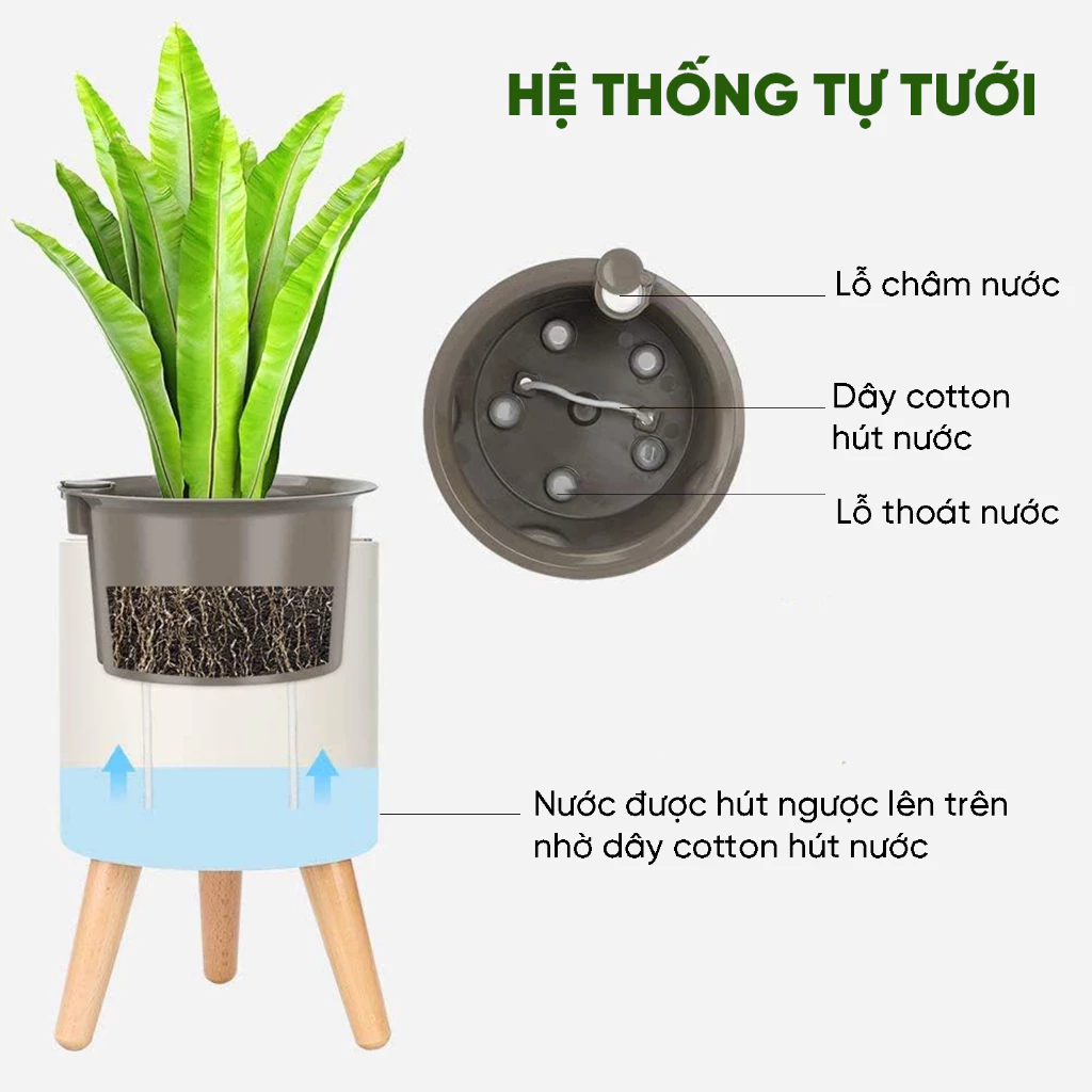 Nước từ lớp chậu ngoài sẽ thẩm thấu qua sợi bấc đặc biệt, từ từ cung cấp độ ẩm cần thiết cho đất trồng theo nhu cầu của cây, giúp duy trì độ ẩm lý tưởng và tránh tình trạng tưới quá nhiều gây úng rễ.