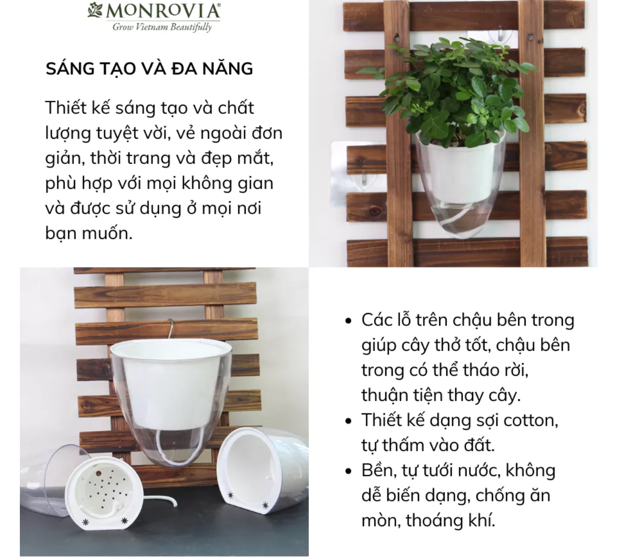 Hãy lựa chọn Chậu Tự Tưới Treo Tường K01 MONROVIA cho không gian sống của bạn ngay hôm nay! Sản phẩm không chỉ giúp bạn dễ dàng chăm sóc cây mà còn là một phần không thể thiếu trong việc làm đẹp không gian sống. Với thiết kế sang trọng, chất liệu bền bỉ, và cơ chế tự tưới thông minh, chậu cây ban công này sẽ mang đến cho bạn sự hài lòng tuyệt đối. Đặt mua ngay để tận hưởng một không gian sống xanh mát, đầy sức sống!
