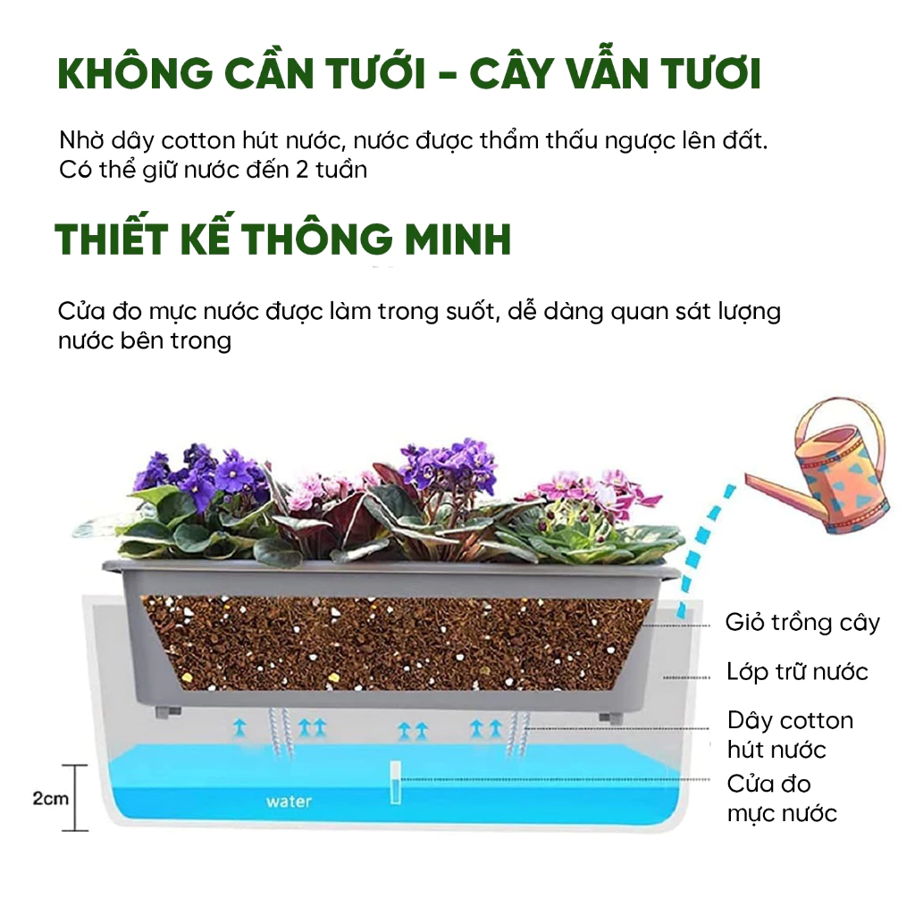 🌿 Hệ Thống Tự Tưới Thông Minh: Nước sẽ được thẩm thấu qua sợi dây bấc theo cơ chế thẩm thấu ngược, giúp cây hút nước từ từ, tránh tình trạng đất bị ướt quá lâu, bảo vệ rễ cây không bị úng. Thiết kế này mang lại sự tiện lợi tuyệt đối cho những người bận rộn.